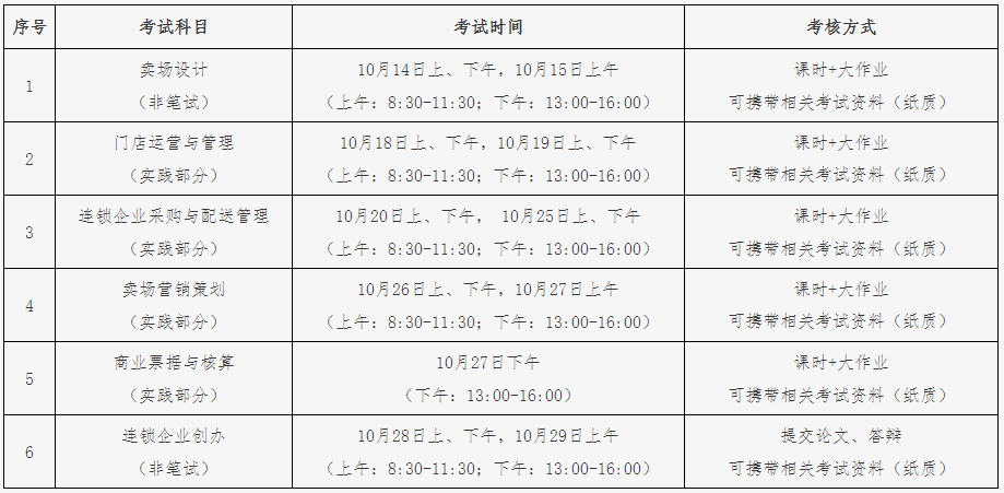 2021年下半年由北京财贸职业学院主考的高等教育自学考试连锁经营管理专业(专科)非笔试及实践类课程定于10月14日—10月29日举行考试。现将具体考试计划安排如下: