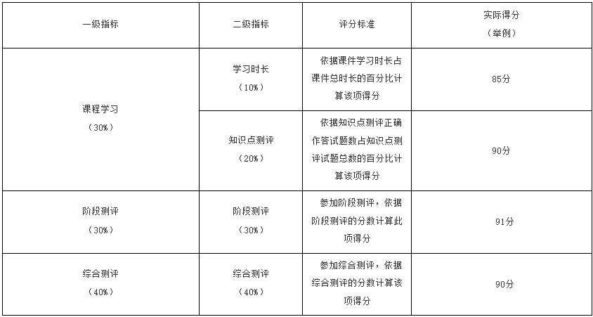 1.网上课程学习测评作业占30%,由课件学习时长和知识点练习组成,其中课件学习时长占10%,由助学平台自动记录考生学习时长,根据课件学习时长占课件要求时长的百分