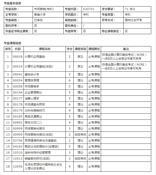 备注:该专业为原开考020313销售管理(专科)专业调整后的专业名称和代码。