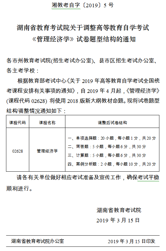 关于调整高等教育自学考试《管理经济学》试卷题型结构的通知