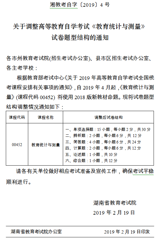 关于调整高等教育自学考试《教育统计与测量》试卷题型结构的通知湘教考自字〔2019〕4号