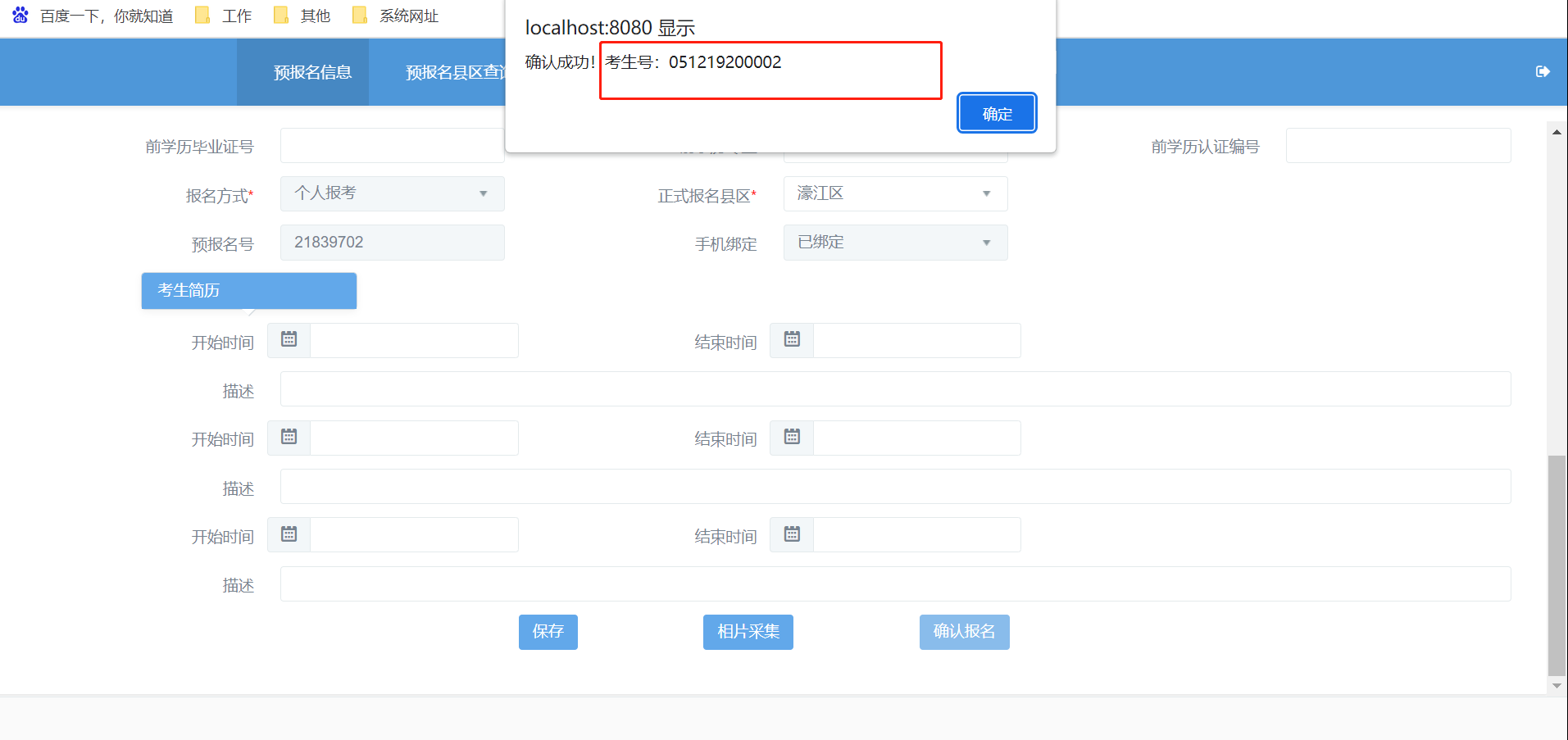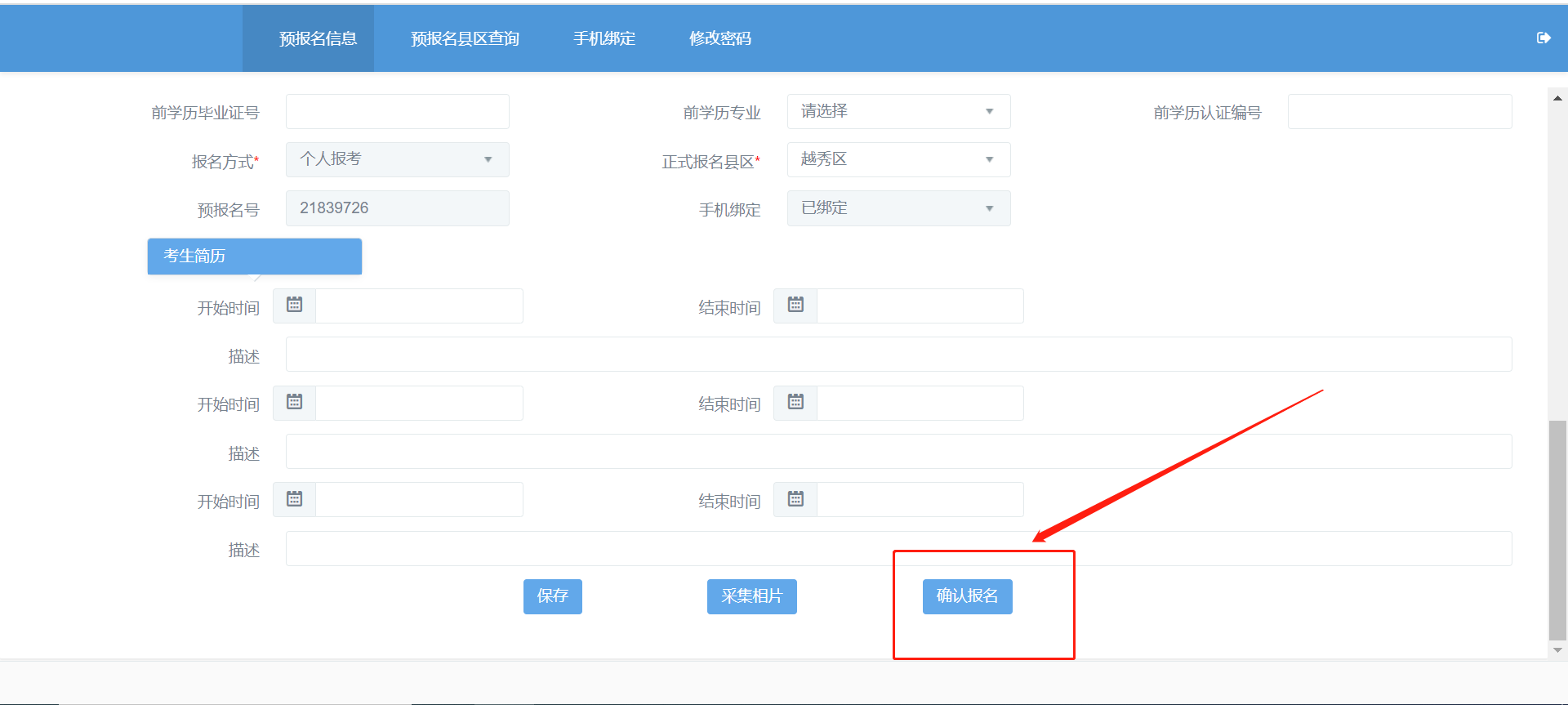 2、点击“考生预报名”,完成预报名信息录入,获取预报名号;
