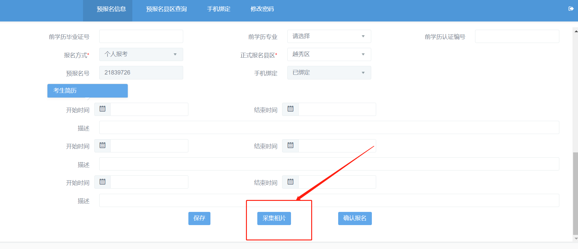 3、输入预报名号、密码及验证码,登录系统,点击“采集相片”;