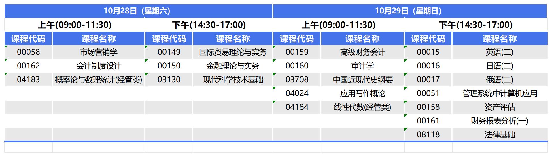 河北自考本科会计学专业(原专业名称:会计),专业代码120203K(原专业代码:020204),2023年10月自考考试时间为10月28日-29日,上午9:00-11:30,下午14:30-17:00,本次考期共开考18门课程,具体科目安排如下: