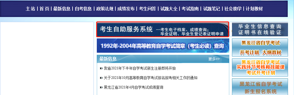 目前,黑龙江自考成绩是通过网上查询通道进行查询的,考生可以直接登录黑龙江省招生考试信息港官方网站,选择“自考频道”,点击“考生自助服务系统”(如下图所示),输入准考证号及姓名登录后,点击“查看历年考试成绩”即可进行查询。(直通车→2021年10月黑龙江自考成绩查询入口)