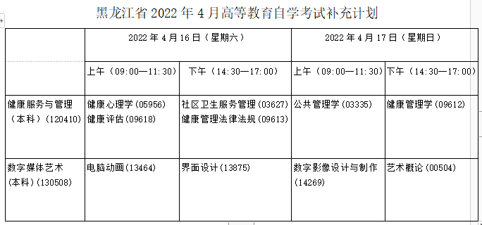 黑龙江省2022年4月高等教育自学考试报名工作已经开始,为了方便考生报考,经研究决定,在我省2022年上半年高等教育自学考试的开考计划中增加“电脑动画(13464)、界面设计(13875)、健康心理学(05956)、健康管理法律法规(09613)”四科省考课程。相关专业考生可依据以下补充计划选择课程报考。