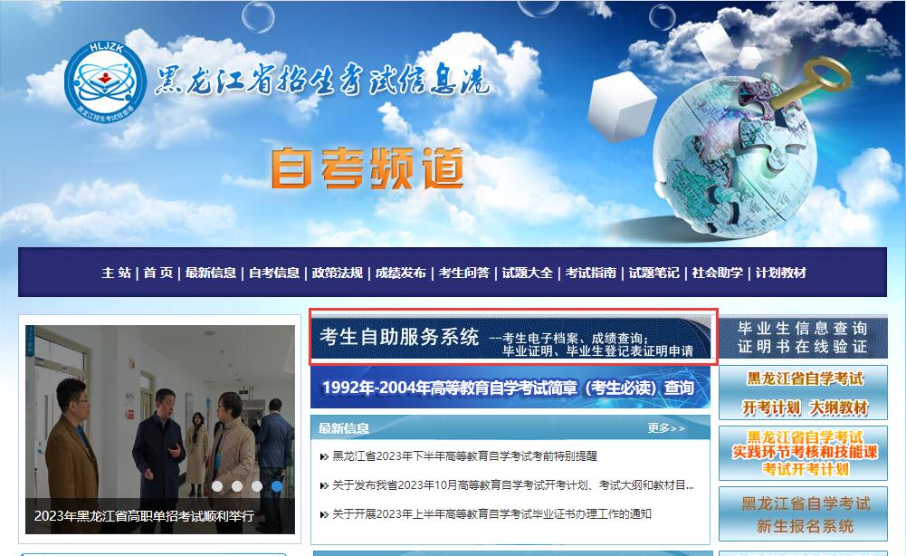 1、考生在黑龙江招生考试信息港页面上方蓝色模块位置,进入考生自助服务系统。