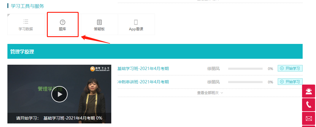 进入“我的网校我的家”首页,在我的课程-正在学习中,找到“学习工具与服务”,点击题库,进入后选择相应题库练习即可。