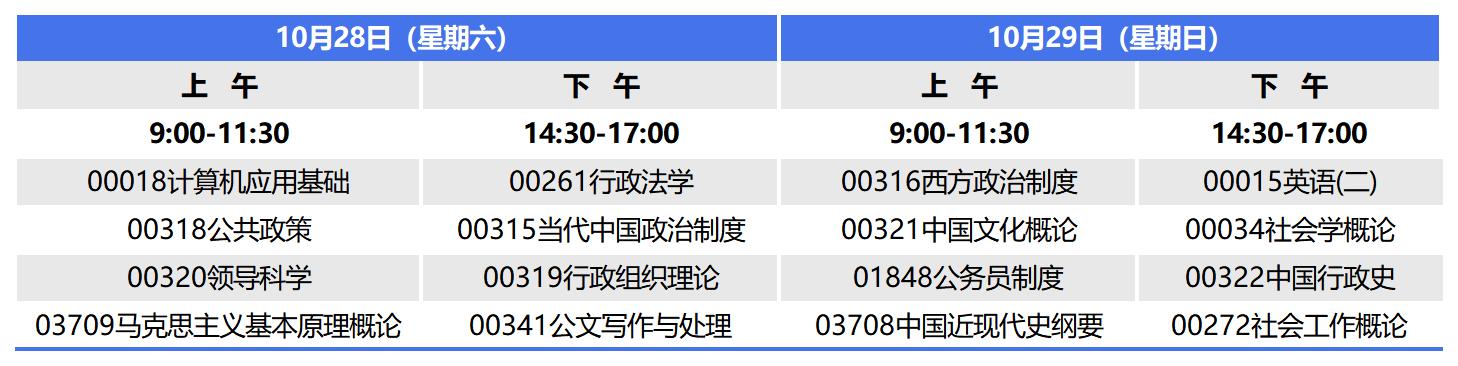 河南自考本科行政管理专业(原专业名称:行政管理学),专业代码120402(原专业代码:030302),2023年10月自考考试时间为10月28日-29日,上午9:00-11:30,下午14:30-17:00,本次考期共开考16门课程,具体科目安排如下: