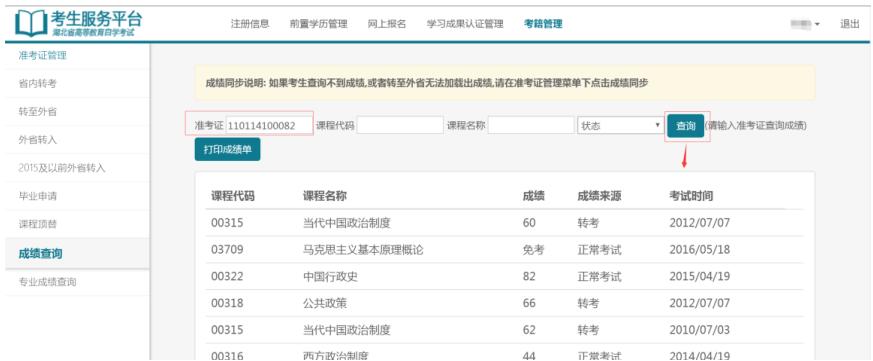 2、平台上方导航栏“考籍管理”-左侧导航栏“成绩查询”-输入准考证号即可查询该准考证下的所有成绩。