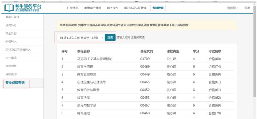 从左侧导航栏“专业成绩查询”可查询特定专业下各科的成绩,这样学员就能简单明了地看到未合格、需继续考核的科目,方便后续安排报名报考,今早完成考核申请毕业。