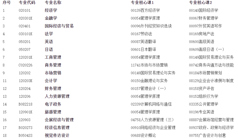 湖南工商大学高等教育自学考试专业核心课程一览表