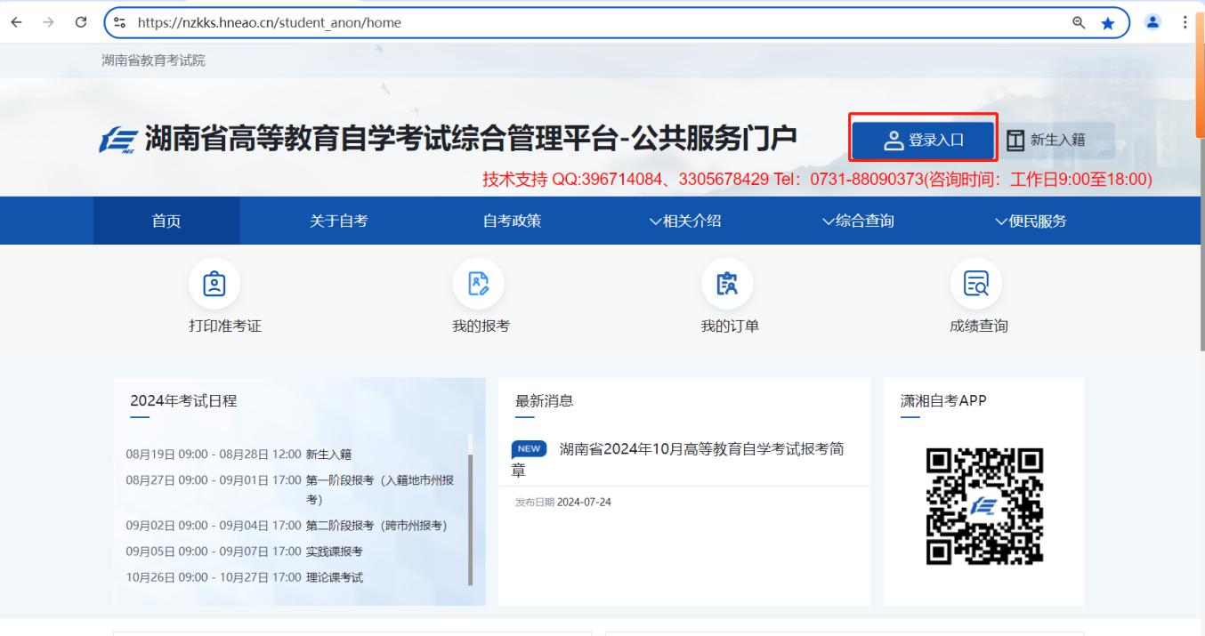 我省2024年10月高等教育自学考试报考工作将于8月27日至9月7日进行,其中理论课程报考时间为8月27日9:00至9月4日17:00;实践课程报考时间为9月5日9:00至7日17:00。考生报考可通过“湖南省高等教育自学考试综合管理平台-公共服务门户”(以下简称“ 湖南自考服务平台”,网址:https://nzkks.hneao.cn)PC 端或“潇湘自考”APP 端两种方式进行。为确保本次报考工作顺利进行,特制定本报考系统 PC 端报考操作指南和“潇湘自考”APP 报考操作指南。
