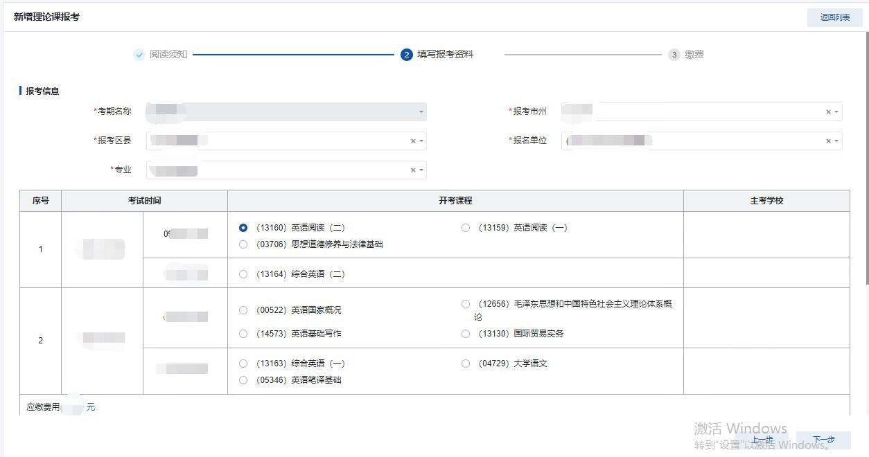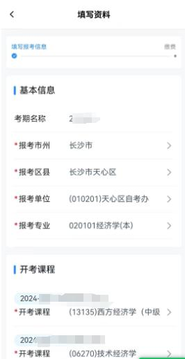 在“填写报考资料”界面,考生按要求选择所报考的地区信息(报考市州和报考区县)和报考专业信息,在所选的专业课程列表中选择本次需要报考的理论课程。