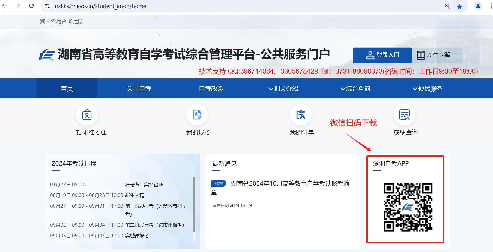 第一步下载“潇湘自考”APP。华为、小米、苹果手机在应用商店搜索“潇湘自考”下载安装 APP,其他品牌手机可在 PC 端打开浏览器(推荐使用谷歌浏览器),在地址栏输入“https://nzkks.hneao.cn”后,进入门户首页界面,如图 1-1 所示,通过手机微信扫一扫上图二维码,下载潇湘自考APP 安装包,并安装,已下载过“潇湘自考”APP 的考生,请确认已更新到最新版本。