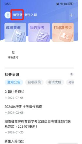 个人手机上,点击安装好的潇湘自考 APP 图标,进入门户首页,如下图 1-2 所示,点击左上角的“请登录”连接,进入登录界面。