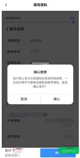 第五步缴纳考试费。考生须认真再次确认选择的课程信息是否准确无误,如需修改,可点击右下角“上一步”,返回“填写报考资料”界面进行修改;如确认无误,点击右下角“去支付”按钮,系统会弹出“确认支付”弹窗,如下图所示:
