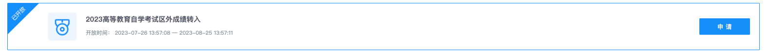 选择申请项目列表中的“2023 高等教育自学考试区外成绩转入申请”,并点击“申请”按钮。