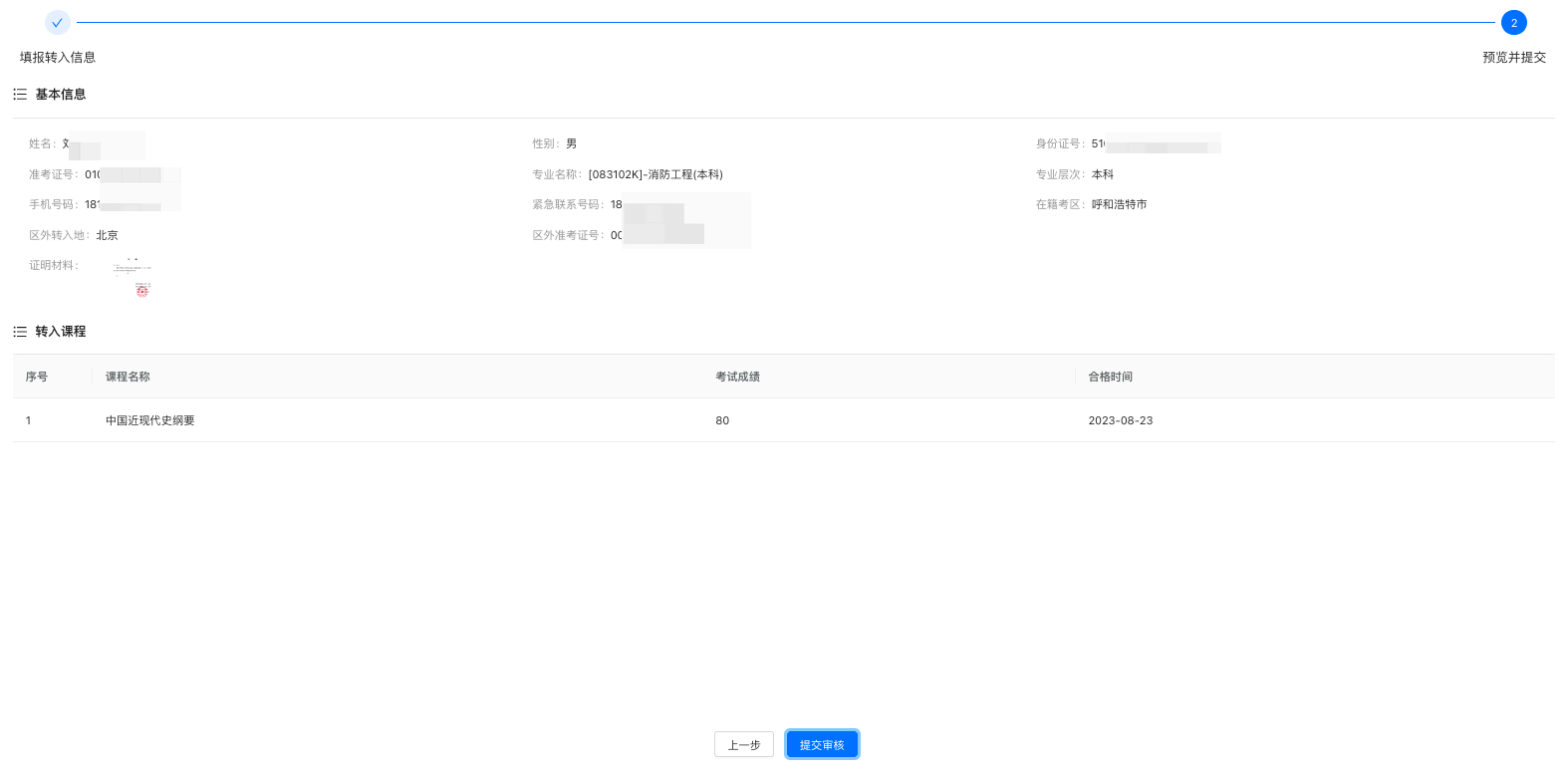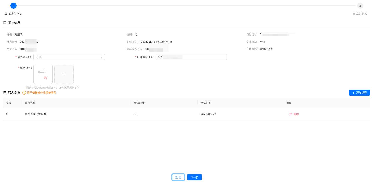 填写转入申请内容,并添加转入课程,并点击下一步