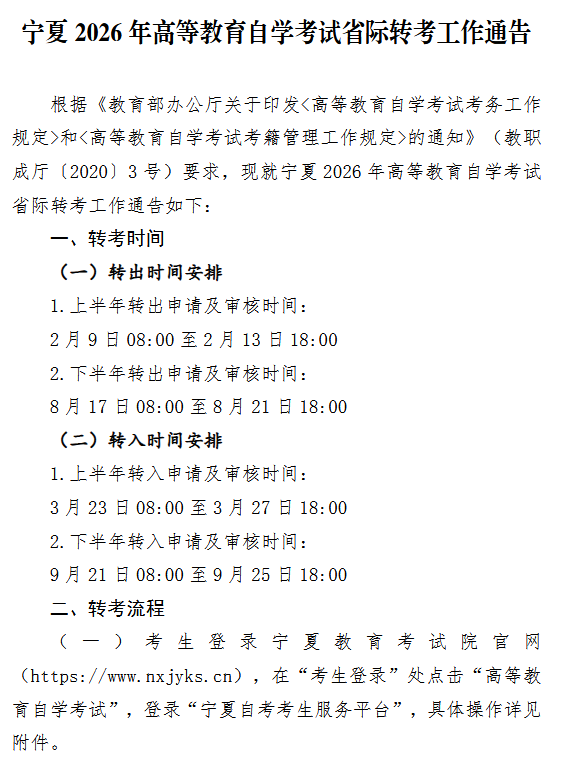 宁夏2026年高等教育自学考试省际转考工作通告