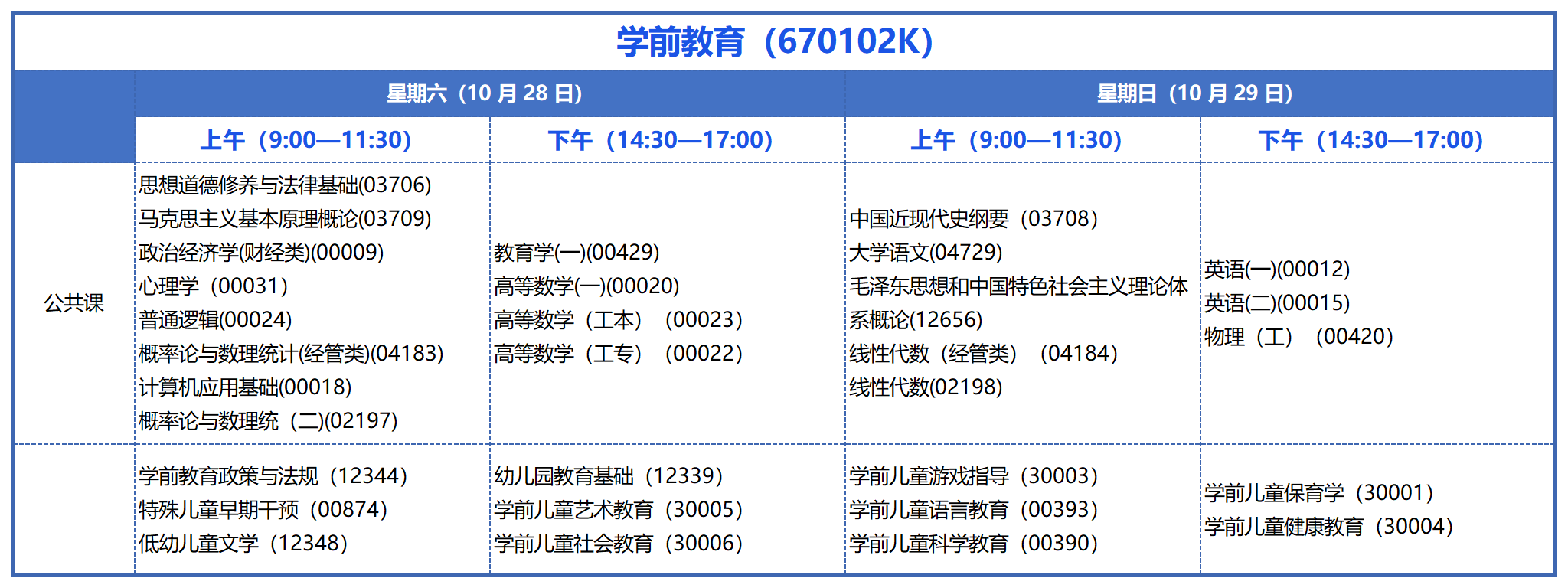 青海自考学前教育(670102K)10月考试安排如下:
