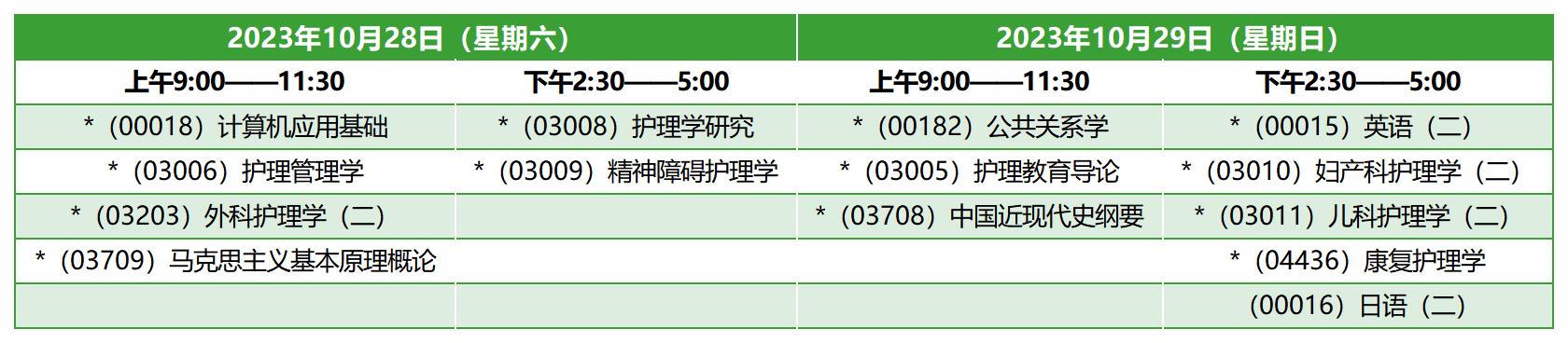 上海自考本科护理学专业,专业代码101101,2023年10月自考考试时间为10月28日-29日、11月4日,上午9:00-11:30,下午14:30-17:00,该专业本次考期共开考14门课程,在11月4日没有安排课程考试,具体课程考试时间安排如下: