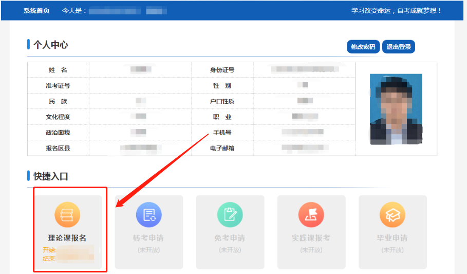四、个人中心,考生身份认证通过后即可登录系统,登录成功后进入“个人中心”。考生可通过快捷入口办理报考的相关业务。