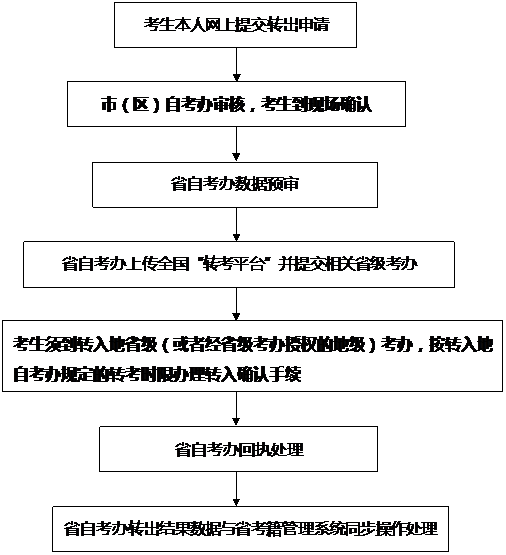 (六)转入手续办理完成后,我省自考办将依据转入地省级考办上传全国“转考平台”的转入办理结果,对转出考生电子档案的在籍状态,在省考籍管理系统中进行变更,完成转考。