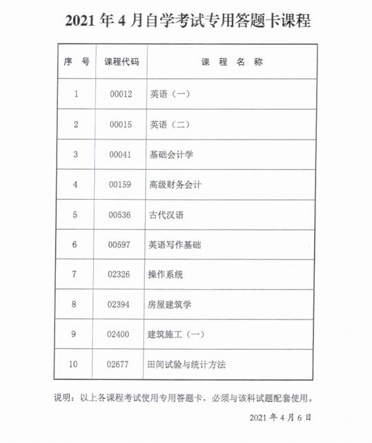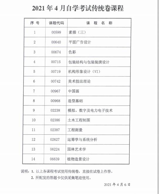 2021年4月陕西自考传统卷课程、专用答题卡课程信息2