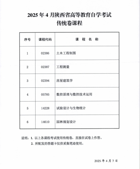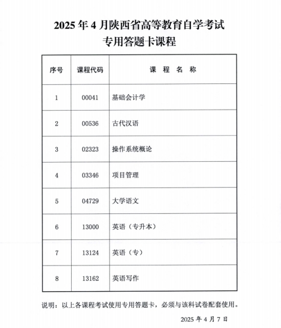 2025年4月陕西省高等教育自学考试传统卷课程、专用答题卡课程信息