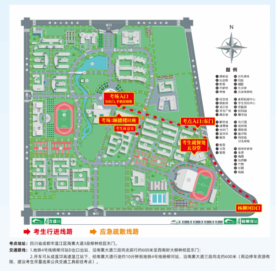 考生出示准考证经查验后由西南财大柳林校区东门进校,直行约600米到达考场。