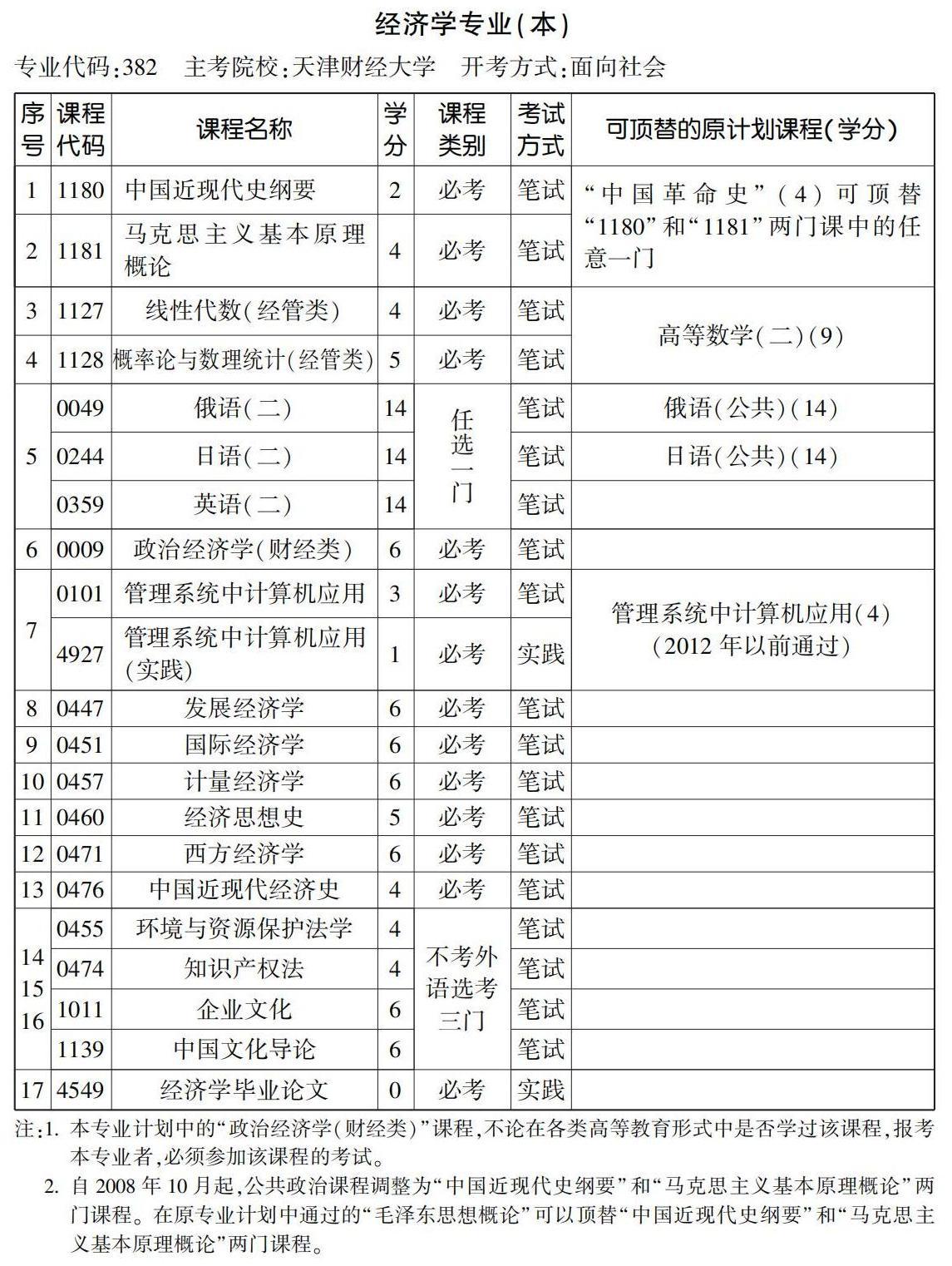 2022年10月天津自考本科经济学专业计划