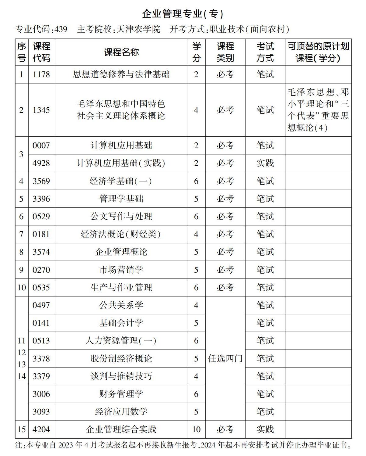 2023年10月天津自考专科企业管理专业计划(停考过渡)