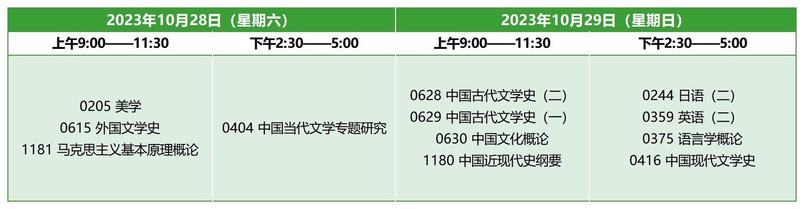 天津自考本科汉语言文学专业,专业代码598,2023年10月自考考试时间为10月28日-29日,上午9:00-11:30,下午14:30-17:00,该专业本次考期共开考12门课程,具体课程考试时间安排如下: