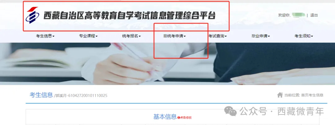 三、查询个人转考状态。登录“西藏自治区高等教育自学考试信息管理综合平台”→点击“非统考申请”→“转考申请” →“点击转考申请”→“转考信息页面”。
