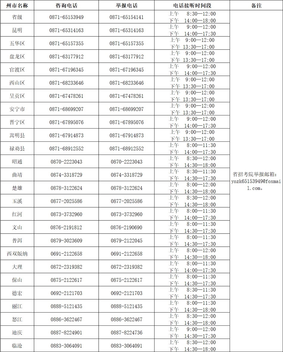 2023年4月云南省第89次高等教育自学考试和上半年高校教师资格认定课程考试咨询及举报电话