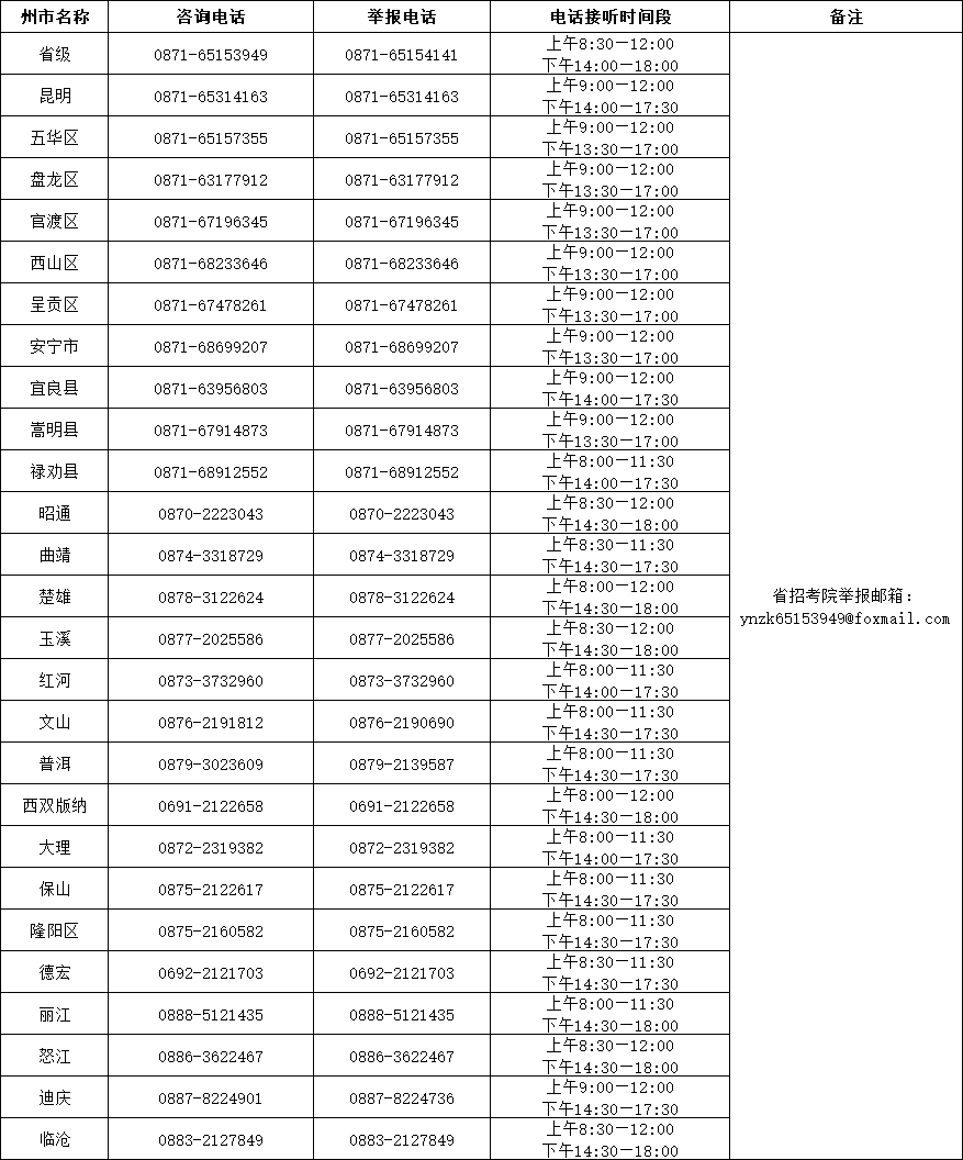 2023年下半年云南省第90次高等教育自学考试咨询及举报电话