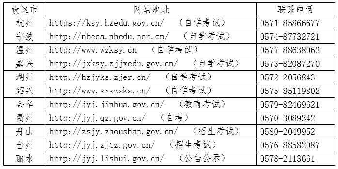 4.请考生务必关注报考地所属设区市教育考试机构网站,及时了解相关信息。各设区市教育考试机构网站地址及联系电话如下: